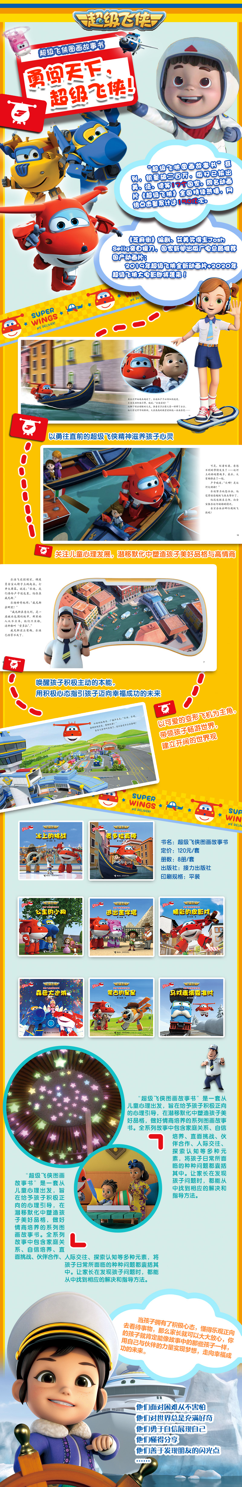 “超级飞侠图画故事书”共8册16集,讲述了一群在国际快递公司工作的小飞机们,为世界各地的小朋友送去愿望包裹,并帮助他们解决难题、实现梦想的故事,大伙儿都亲切地将这群积极阳光、乐于助人的小飞机们称为“超级飞侠”。每一位超级飞侠都拥有一种独特的“超级飞侠”精神——他们自信、勇敢、善良、智慧,同时又热情、好奇、包容、执着;他们每出一次任务都会给孩子传递无限的正能量,带领孩子克服一个个阻碍梦想实现的难题,帮助孩子学会相信自己、信赖同伴、懂得合作,成为一个善于解决问题,善于帮助他人的积极阳光小孩。