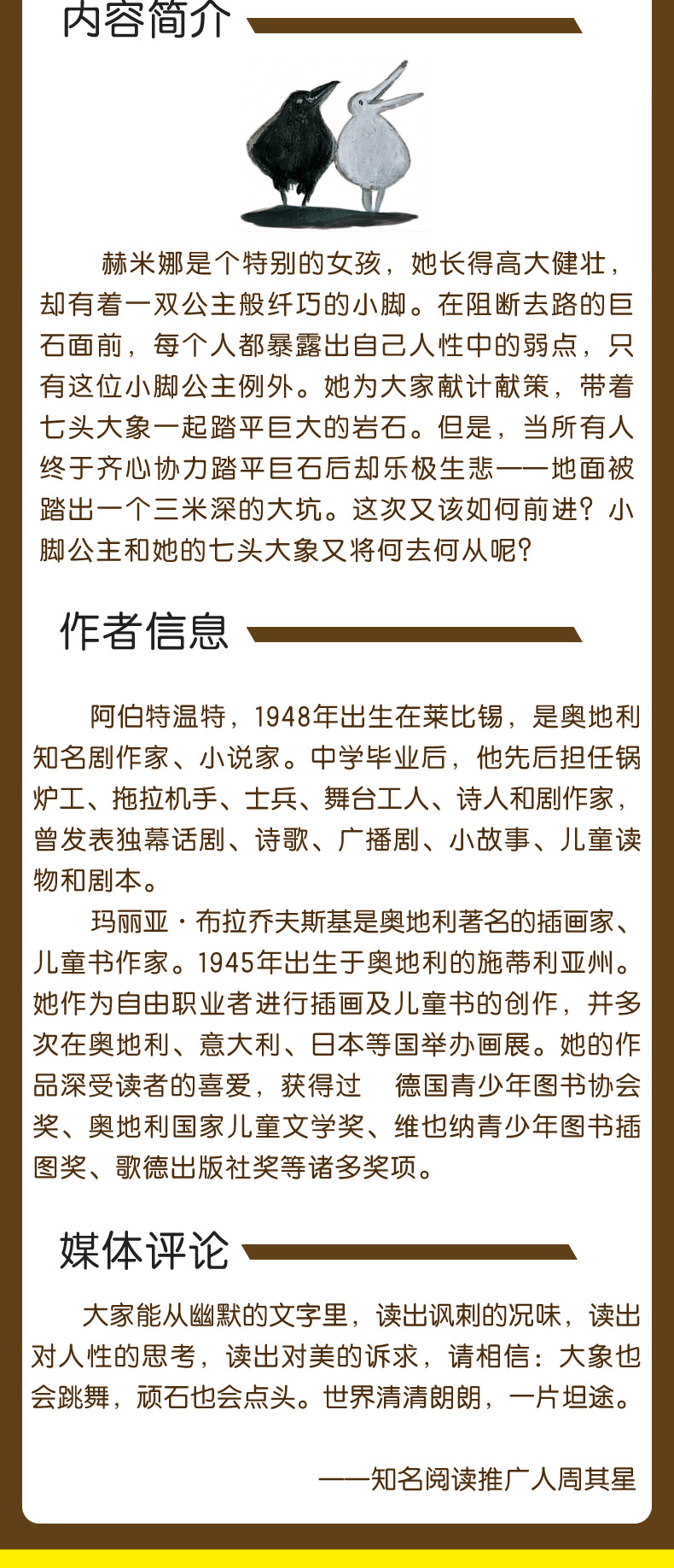 赫米娜是个特别的女孩,她长得高大健壮,却有着一双公主般纤巧的小脚。在阻断去路的巨石面前,每个人都暴露出自己人性中的弱点,只有这位小脚公主例外。她为大家献计献策,带着七头大象一起踏平巨大的岩石。但是,当所有人终于齐心协力踏平巨石后却乐极生悲——地面被踏出一个三米深的大坑。这次又该如何前进?小脚公主和她的七头大象又将何去何从呢?