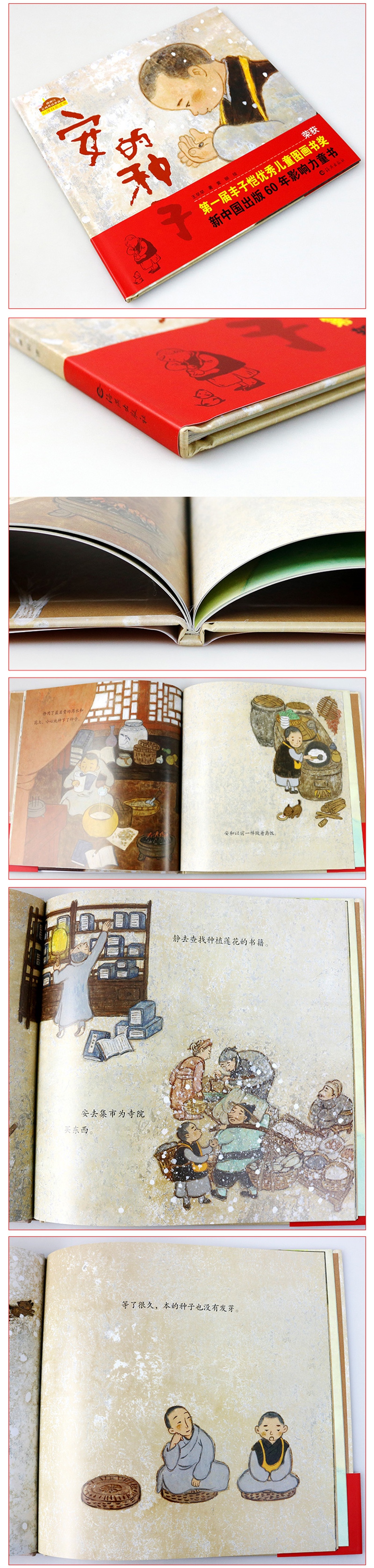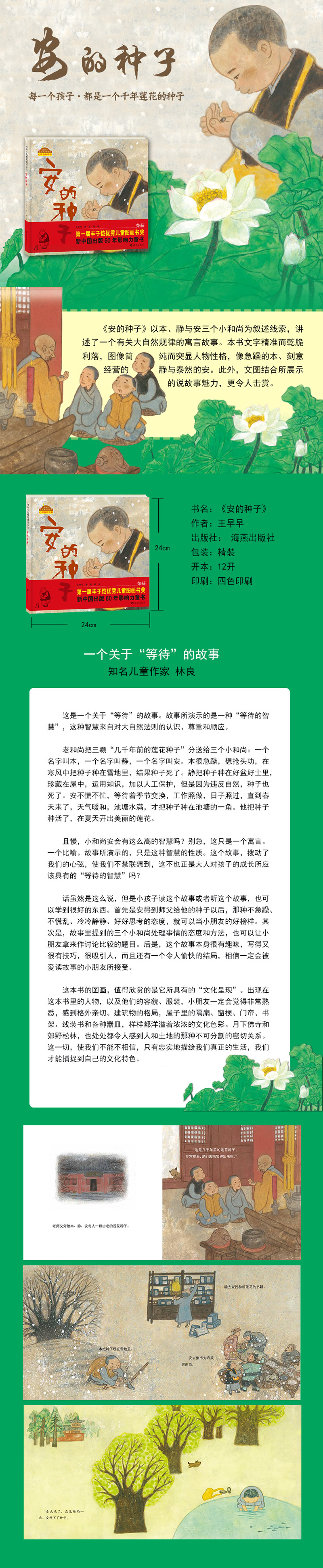 《安的种子》丰子恺儿童图画书奖“优秀儿童图画书奖”!以本、静与安三个小和尚为叙述线索,讲述了一个有关大自然规律的寓言故事。本书文字精准而乾脆利落,图像简纯而突显人物性格,像急躁的本、刻意经营的静与泰然的安。此外,文图结合所展示的说故事魅力,更令人击赏。本书的图画,最值得欣赏的是它所具有的“文化呈现”。出现的人物,以及他们的容貌、服装,小朋友一定会觉得非常熟悉,感到格外亲切。