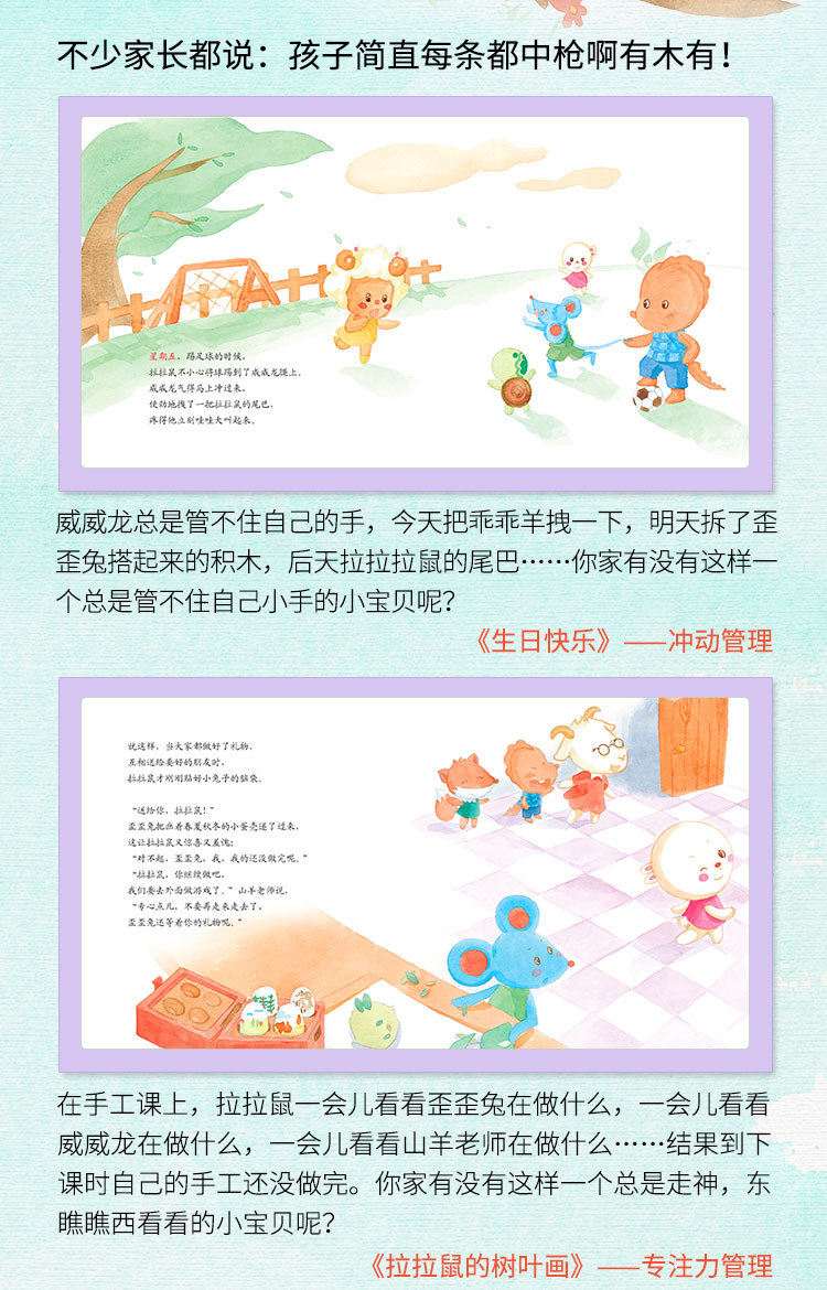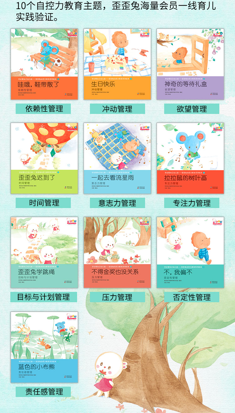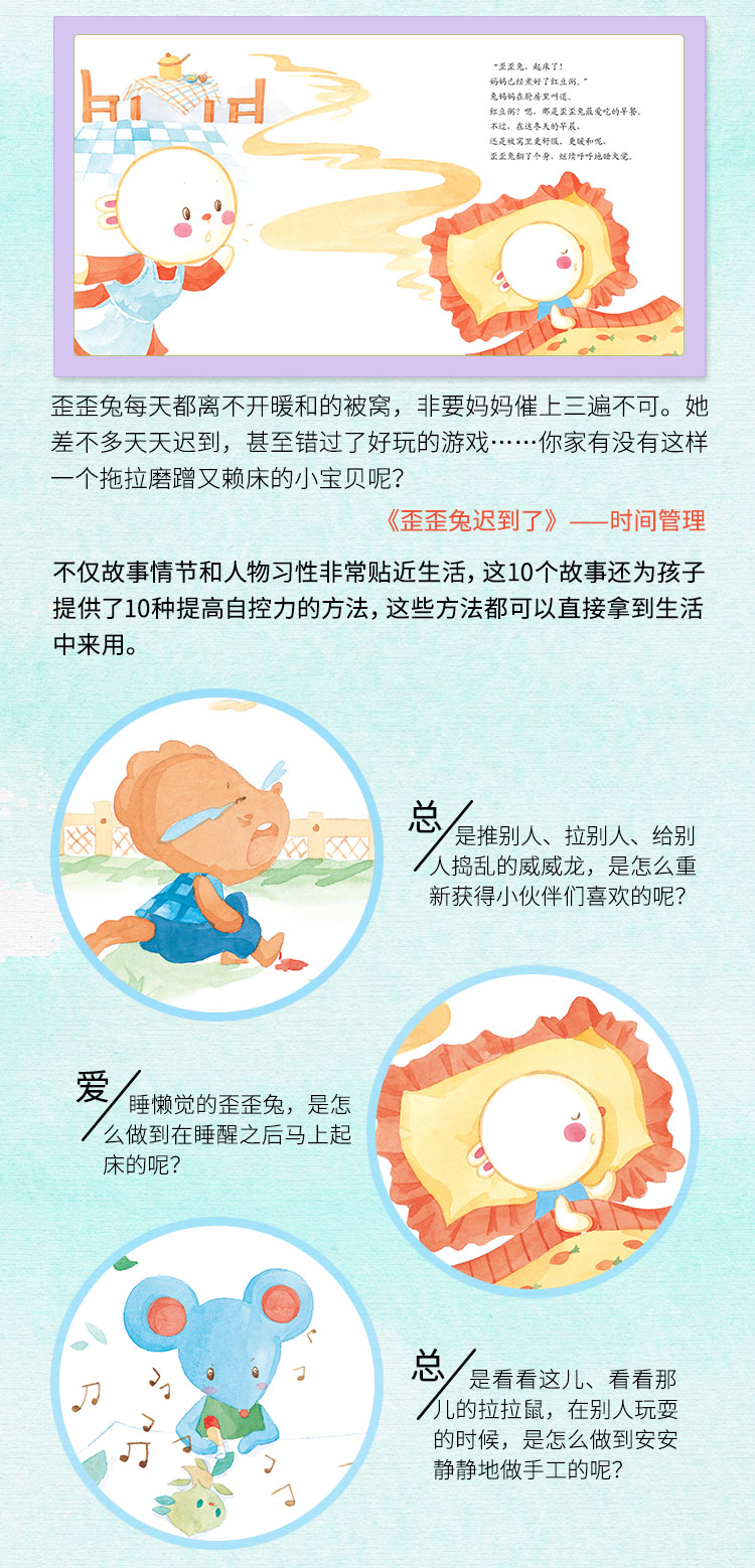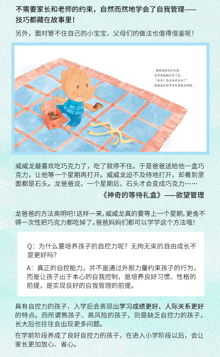 这套绘本通过10个精彩有趣的故事,帮助2-6岁孩子进行依赖性管理、冲动与欲望管理、意志力与专注力管理、目标与时间管理等10大自我管理能力的培养……实现从外部控制到自我控制的关键过渡,从而为养成良好习惯与性格、实现有效的自我管理奠定基础。2-6岁、幼儿园小班到学前班适读。