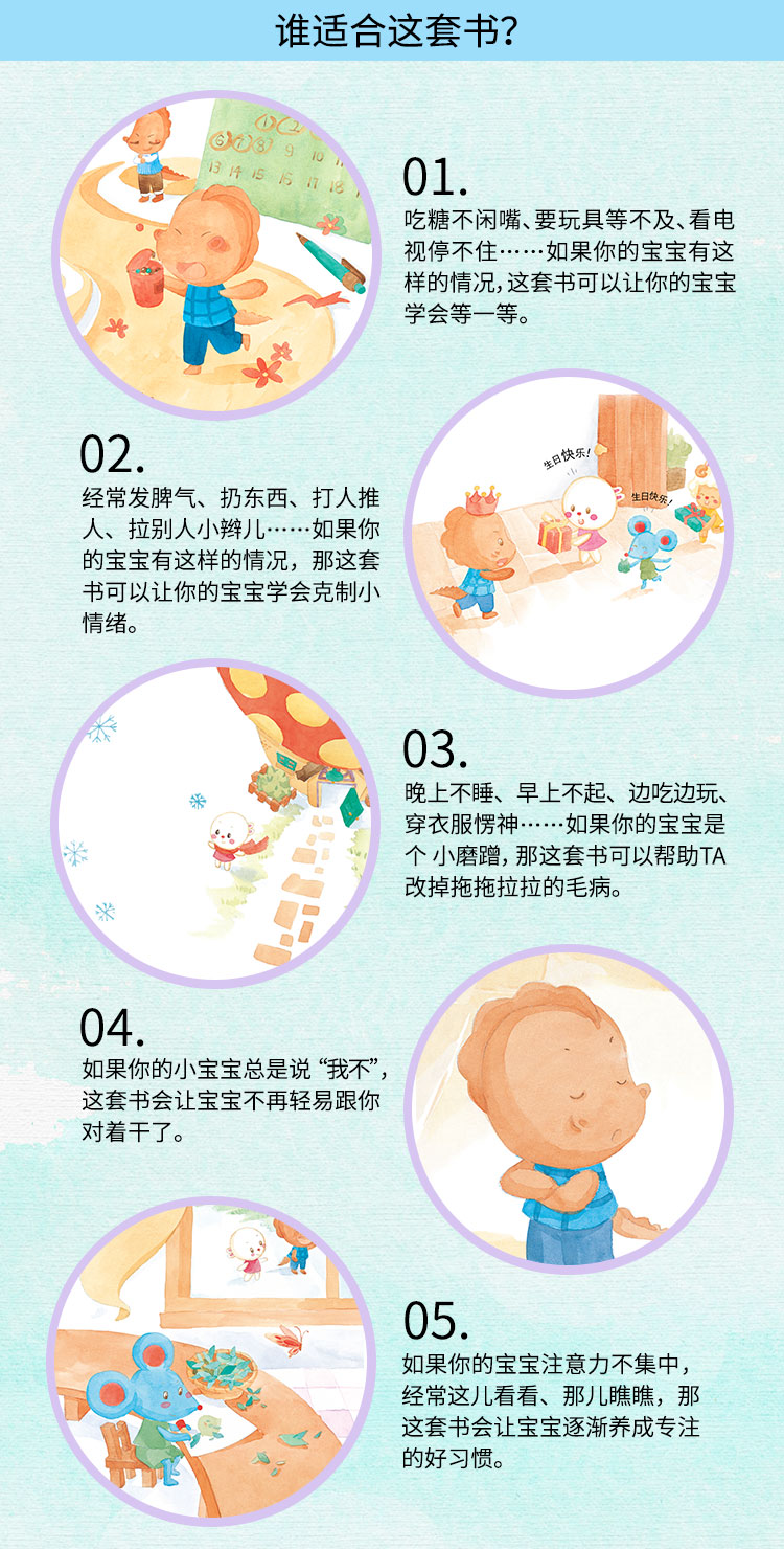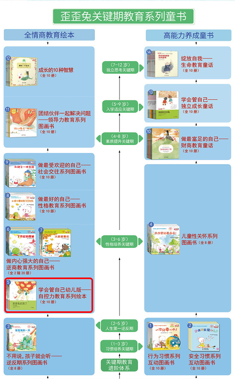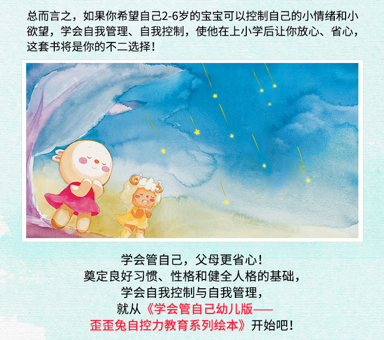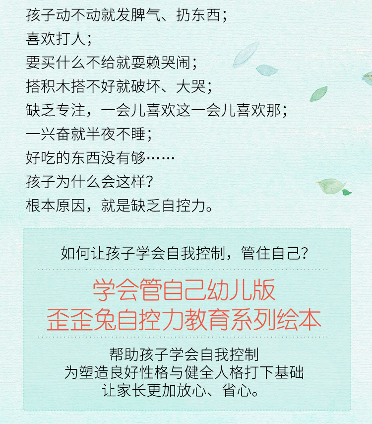 这套绘本通过10个精彩有趣的故事,帮助2-6岁孩子进行依赖性管理、冲动与欲望管理、意志力与专注力管理、目标与时间管理等10大自我管理能力的培养……实现从外部控制到自我控制的关键过渡,从而为养成良好习惯与性格、实现有效的自我管理奠定基础。2-6岁、幼儿园小班到学前班适读。