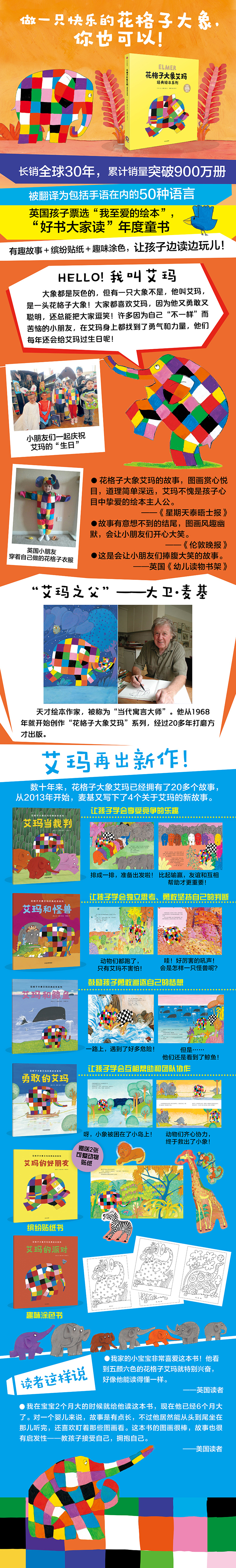 《花格子大象艾玛经典绘本系列》全6册,故事+涂色+贴纸游戏,赠送精美动物贴纸!长销全球30年,被翻译为包括手语在内的50种语言,全球累计销量突破900万册的“花格子大象系列”全新作品,著名童书推广人、“两小千金妈妈”范晓星倾情翻译