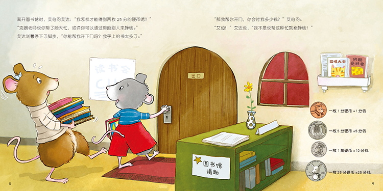 图书馆里新添了一台铸币机,往机器里投入两枚2 5分硬币就能换一枚《史莱姆队长》纪念币。为了换喜爱的纪念币,艾伯帮尼波太太、斯科先生溜宠物,帮皮特表哥照顾小鼠三胞胎,得到了好几枚硬币。但是还差一点儿,该怎么办呢?在帮助别人的过程中,艾伯学会了认识货币和货币换算。