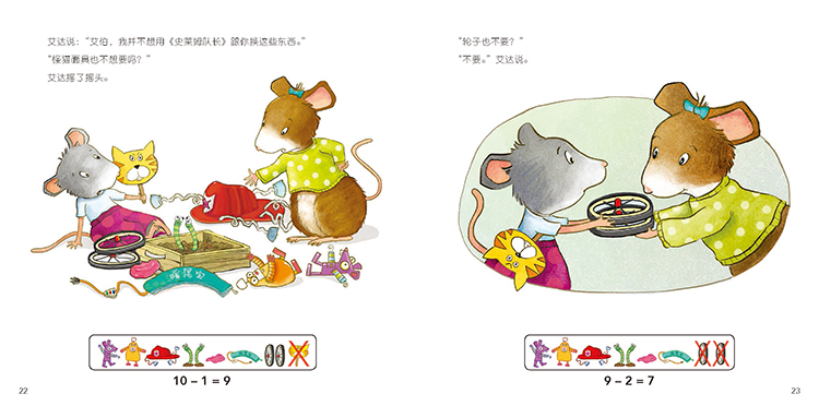 姐姐艾达从图书馆带回来艾伯超喜欢的图书《史莱姆队长》第二册,艾伯忍不住想先看,于是他打算用玩具来和艾达交换。一个玩具,加一个玩具,再加一个玩具……艾伯到底要用多少个玩具才能换来先看《鼠小弟爱数学4~6岁(全10册)》呢?艾达会喜欢艾伯的玩具吗?这个过程中,艾伯学会了简单加减法。