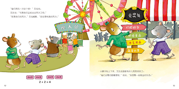 老鼠镇游园会开幕啦,艾伯想叫上好朋友利奥一起去,可是利奥不在家。艾伯打算加倍玩,帮利奥把他那份也玩了!在游园会上,艾伯玩了两次投球,四次摩天轮,吃了双份比萨,赢了两份玩具鼠大礼包,还收获了意外的惊喜!在逛游园会的过程中,艾伯学会了倍数概念。