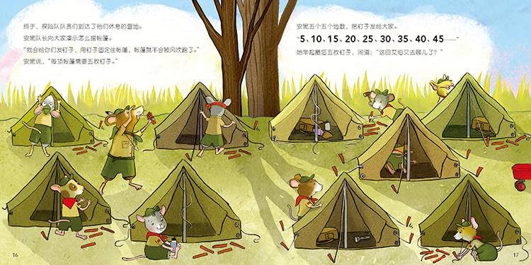 啃啃探险队去森林里露营啦!在徒步的过程中,安妮队长点名、给大家分奶酪泡芙(每人2块)、分帐篷钉子(每人5枚)、让大家捡篝火木柴(每人10根),但每次艾伯都不知所踪。他去哪儿了呢?路上还发生了什么趣事?在徒步过程中,小老鼠们学会了跳数。