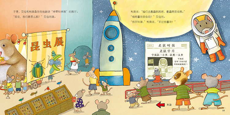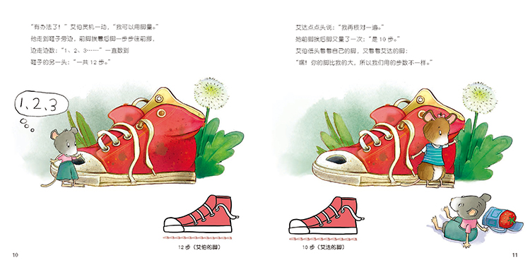 艾伯和艾达发现了一只人类的鞋子,他们想把它运回家当游戏屋,但不知道家里能不能放得下。姐弟俩开动脑筋,用了自己的脚丫、奶酪棒、回形针等好几种工具来测量鞋子的大小和房间的长度。鞋子到底有多大呢?家里能放下吗?在这个过程中,小老鼠们学会了“非标准单位测量“。