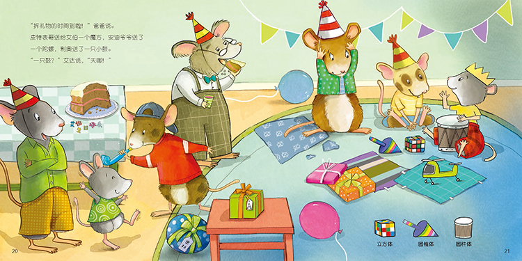 今天是艾伯的生日,出门玩时,他试骑了好朋友利奥的新滑板车,他特别喜欢。在生日派对上,艾伯拆开了礼物,有立方体的魔方,圆锥形的陀螺,圆柱状的小鼓……还有爸爸妈妈送的球形头盔。原来,这是为了配姐姐艾达准备的礼物——滑板车!