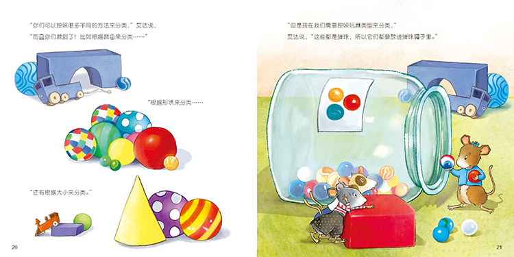 艾伯和小伙伴们趁人类不在家,偷偷去了孩子们的玩具屋玩。艾伯玩得太兴奋了,一不小心从玩具架上掉下来,还拽倒了玩具盒,把一切弄得乱七八糟。在孩子们回来前,他们能把玩具收拾好吗?在整理玩具的过程中,小老鼠们学会了按颜色、大小、形状等特征来分类。