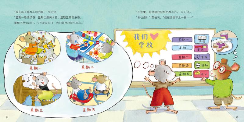 艾伯上小学了,但学校不像家里,想干什么就干什么,各项活动都有固定的时间安排:星期一阅读、星期二美术、星期三音乐……一开始,艾伯总是忘记各种规则。但没过几天,艾伯就理解了今天、明天、后天、星期等时间概念,很快适应了学校的新生活!