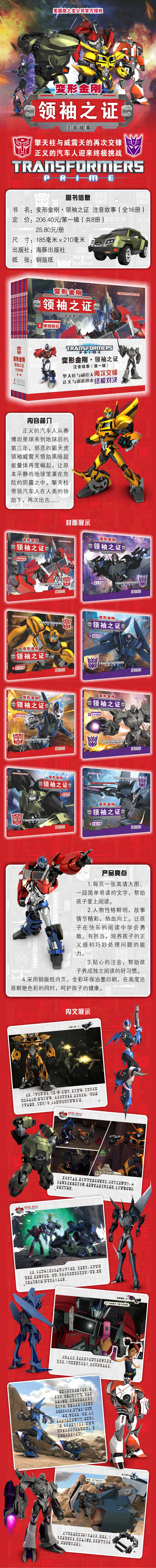 这套书改编自孩之宝大热系列动画片《变形金刚:领袖之证》,故事讲述了正义的汽车人从母星塞伯坦星球来到地球后的第三年,邪恶的霸天虎领袖威震天借助黑暗超能量体再度崛起,让原本平静的地球笼罩在危险的阴霾之中。擎天柱和大黄蜂带领救护车、阿尔西和隔板,在地球人杰克、拉菲和美琪的帮助下,再次出击,为保护地球而战……本套书教会孩子们责任和勇气的重要性,帮助他们找到自我的价值,提高应对挑战和解决问题的能力,健康成长。