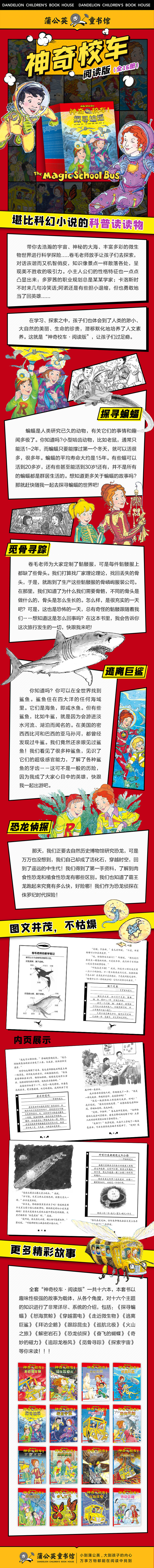 《神奇校车●阅读版(全16册)》侧重文字阅读的神奇校车故事,适合小学低年级独立阅读,少量黑白插画过渡儿童阅读“图画依赖”现象。(蒲公英童书馆出品)神奇校车阅读版;来了!神奇校车由图画书扩充到了小说,这也是一套科学桥梁阅读读物。书中我们熟悉的小主人公跟随他们的弗瑞丝老师,带你去浩瀚的宇宙、神秘的大海、丰富多彩的微生物世界进行科学探险……故事情节引人入胜堪比科幻小学,对话诙谐而又机智俏皮,知识像景点一样散落各处,呈现美不胜收的吸引力。孩子们对科学的兴趣和求知欲以澎湃之势感染着每位读者,而卷毛老师放手让孩子们去探索,只偶尔启发和补充的学习方式,让人羡慕甚到动容。讲述的过程中,小主人公们的性格特征也一点点凸显出来,多罗茜的职业规划总是某某学家;卡洛斯时不时来几句冷笑话;阿诺还是有些胆小退缩,但也勇敢地当了回英雄……在学习、探索之中,孩子们也体会到了人类的渺小、大自然的美丽、生命的珍贵,潜移默化地培养了人文素养。这是神奇校车阅读版;,让孩子们过足瘾。