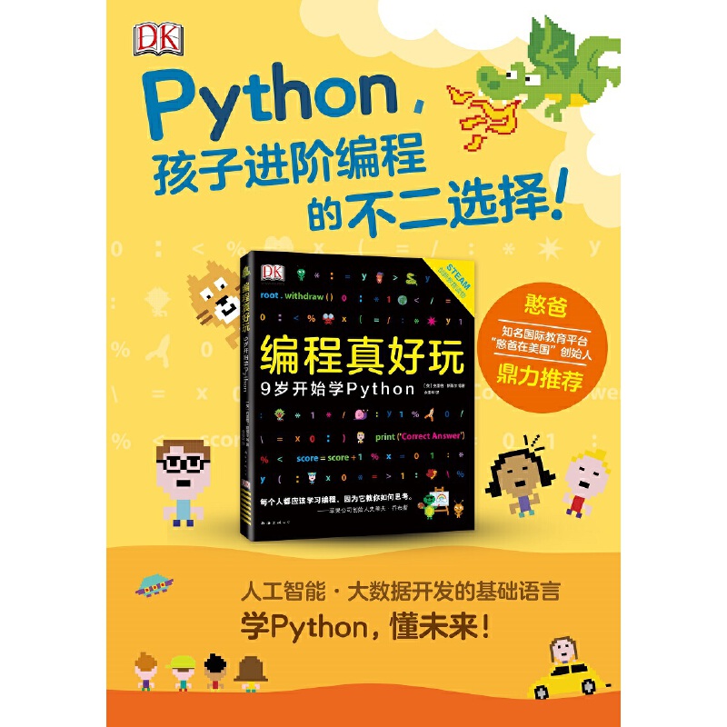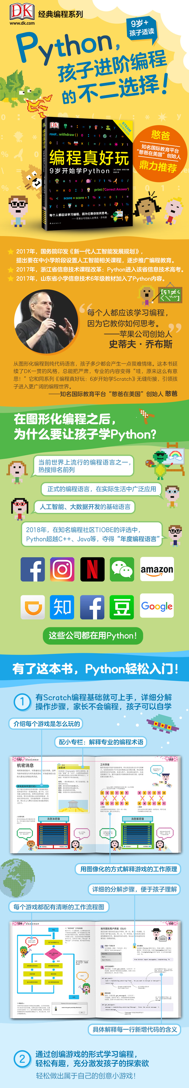 想让孩子进阶学习编程,功能强大的Python是不二选择。但从图形化编程到纯代码语言,孩子多少都会产生一点畏难情绪。《DK编程真好玩:9岁开始学Python》延续了DK一贯的风格,总能把严肃,专业的内容变得“哇,原来这么有意思!”。书里从零开始,几行代码完成一个小任务小游戏,孩子一看就跃跃欲试。分解代码,循序渐进,让孩子成就感满满,还能举一反三。它和同系列《编程真好玩:6岁开始学Scratch》无缝衔接,为孩子打开了更广阔的编程世界。——憨爸(知名国际教育平台“憨爸在美国”创始人)