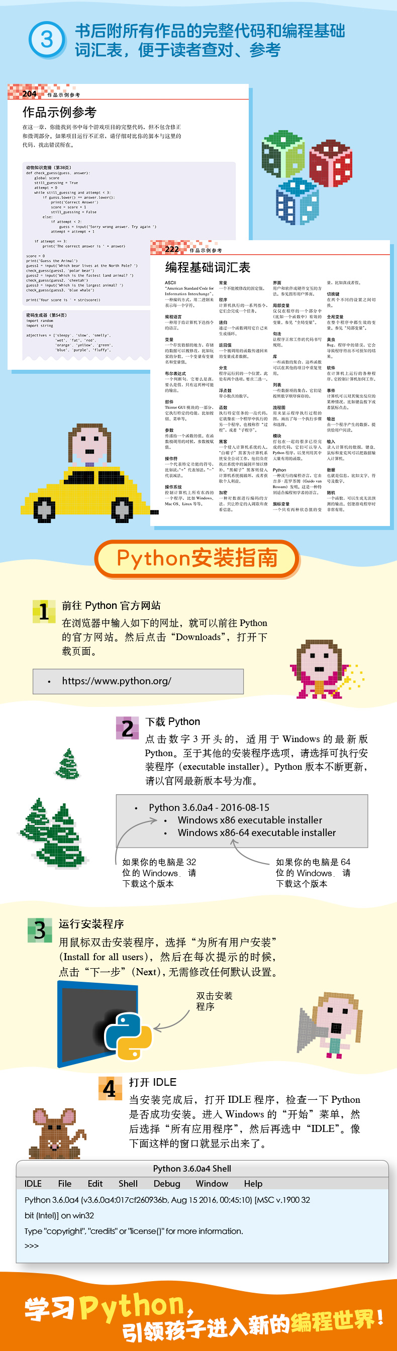 ●书后附所有作品的完整代码和编程基础词汇表,便于小读者查对、参考