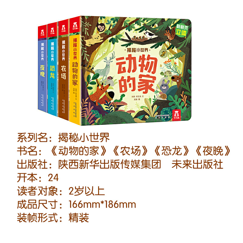 乐乐趣“揭秘小世界”系列是专为低幼儿童创作的“童眼看世界”认知绘本,旨在让孩子通过各种各样的创意“洞洞”和“翻翻”,阅读经典、认识世界。此系列包含《动物的家》《农场》《恐龙》《夜晚》。多样主题、丰富内容和童趣插画,搭配孩子喜闻乐见的立体互动形式,充分激发和满足孩子的好奇心,锻炼孩子的手部精细动作,让孩子在戳洞洞、抠翻翻的游戏中探索自然世界的秘密!